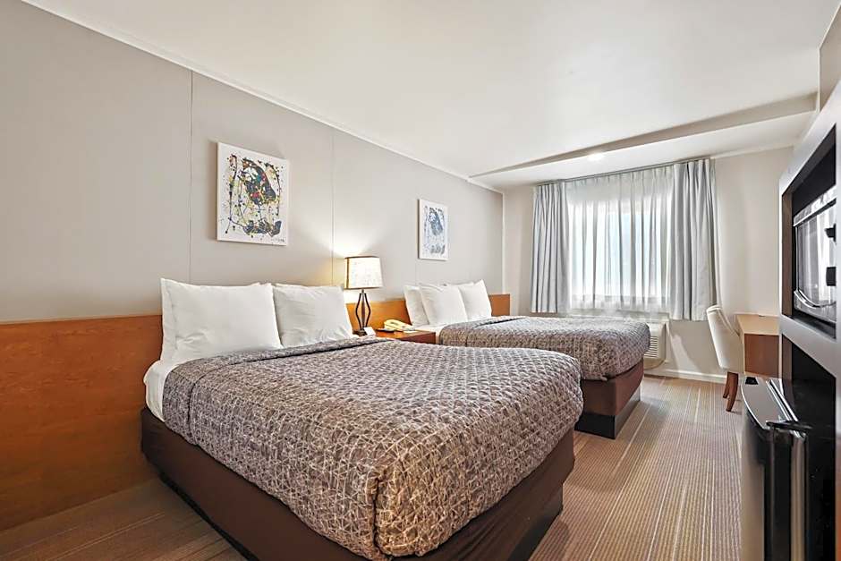 This room features 2 double beds, a microwave, refrigerator, hairdryer and TV.